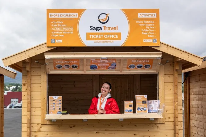 Seu dia inclui transporte do porto de Akureyri com WiFi a bordo, ingressos para o Museu das Casas de Turfa Grenjaðarstaður e para a Lagoa da Floresta (com toalha), para você aproveitar cachoeiras e piscinas termais sem se preocupar com nada.