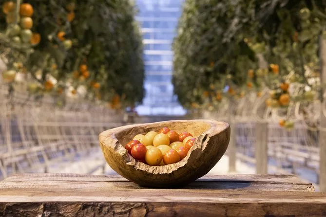 Na visita você prova tomates frescos na estufa; outras comidas podem ser compradas se quiser.
