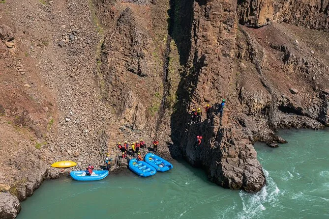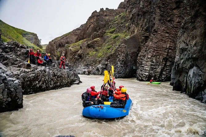 Seu dia inclui transporte entre Akureyri (se selecionado) e a base do rio, todo o equipamento necessário para rafting como roupa seca completa, capacete e luvas, caiaques de segurança acompanhando os guias certificados pela Federação Internacional de Rafting — além de lanches à beira do rio após descer as corredeiras mais selvagens da Islândia.