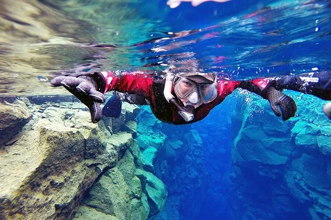 Seu dia inclui encontro com guia certificado PADI em Thingvellir, todo o equipamento necessário para snorkel, incluindo drysuit ou wetsuit conforme sua escolha, fotos profissionais feitas durante o mergulho nas águas claras da fissura Silfra, além de chocolate quente para esquentar logo após o mergulho.
