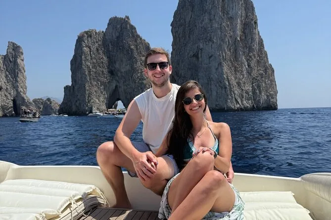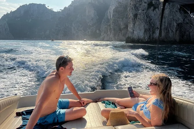 Seu dia inclui refrigerantes a bordo, além do uso de toalhas de praia e máscaras de snorkel; você vai relaxar em decks acolchoados enquanto seu skipper local te guia por grutas e formações rochosas icônicas, retornando ao porto de Capri à tarde ou à noite.