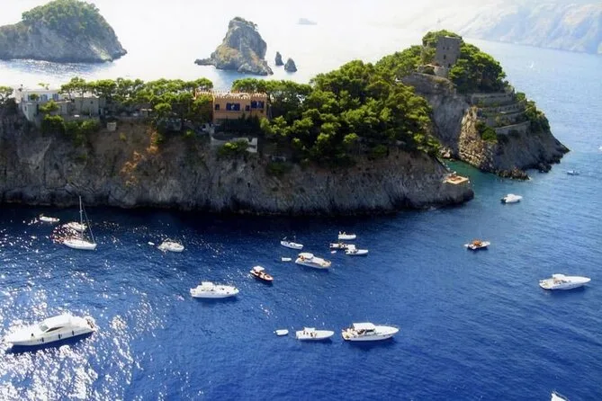 Evite o trânsito costeiro navegando de Sorrento pela Costa Amalfitana, com paradas para nadar nas ilhas Li Galli e na praia de Arienzo. Explore as ruas perfumadas de limão de Amalfi e perca-se nas escadarias coloridas de Positano antes de voltar com cabelo salgado e histórias novas.