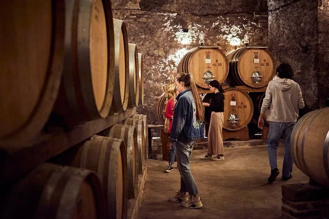 Sim, você visita uma adega histórica subterrânea para uma degustação guiada do Vino Nobile di Montepulciano DOCG.