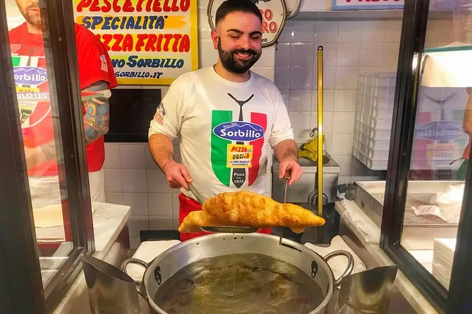 Você vai provar biscoitos taralli, mozzarella de loja tradicional, pizza frita, gelato, doces como sfogliatella e babà, além de limoncello.