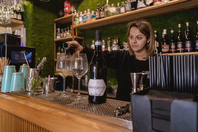 Sim, você vai degustar vinhos sicilianos harmonizados com os petiscos de rua durante o passeio.