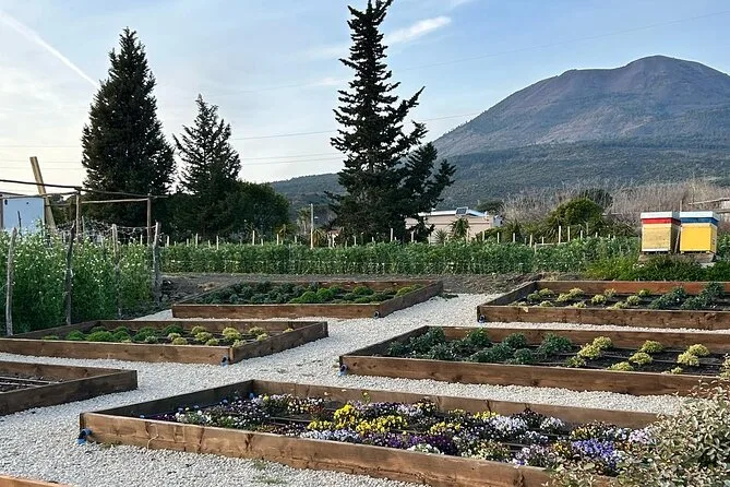Seu dia inclui transfer ida e volta de Pompeia até a fazenda no Monte Vesúvio, um almoço orgânico tranquilo com queijos, embutidos ou pratos vegetarianos, ravioli caseiro e torta de limão de sobremesa — tudo harmonizado com vinhos locais e água, antes de voltarmos juntos no fim da tarde.