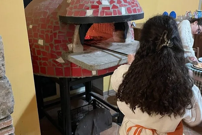 Seu dia inclui transfer do centro de Sorrento até uma fazenda no alto da colina, onde você vai aprender a fazer massa de pizza tradicional com orientação de um chef profissional. Na chegada, suco fresco, depois você assa sua própria pizza Margherita ou Marinara no forno de lenha, almoça ao ar livre com vinho e aperitivos locais, e termina com sobremesa caseira e limoncello antes de voltar relaxado — e provavelmente satisfeito.