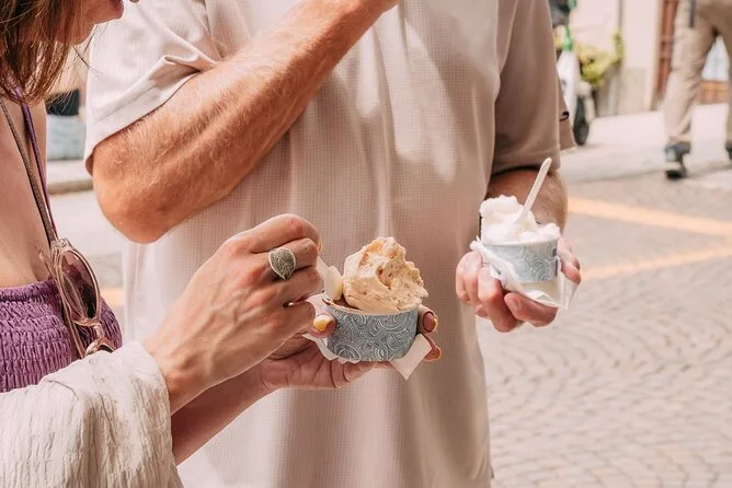 A duração exata não é especificada, mas cobre várias paradas incluindo café, almoço, degustações e gelato; espere algumas horas caminhando e comendo.