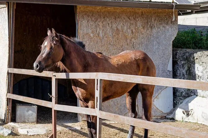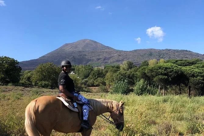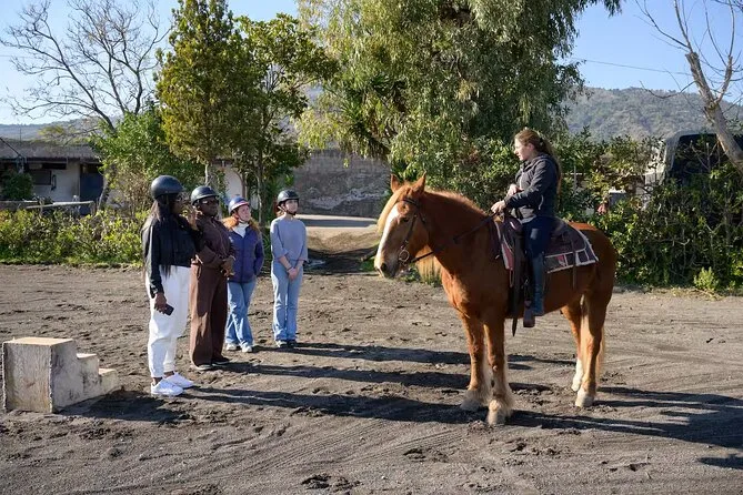 Seu dia inclui transporte de ida e volta saindo de Pompeia, água engarrafada guardada na sela para as pausas na trilha, capacetes para todos (independente da experiência) e um passeio guiado de uma hora a cavalo pelas encostas vulcânicas a 500 metros de altitude, antes de voltarmos juntos.