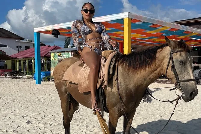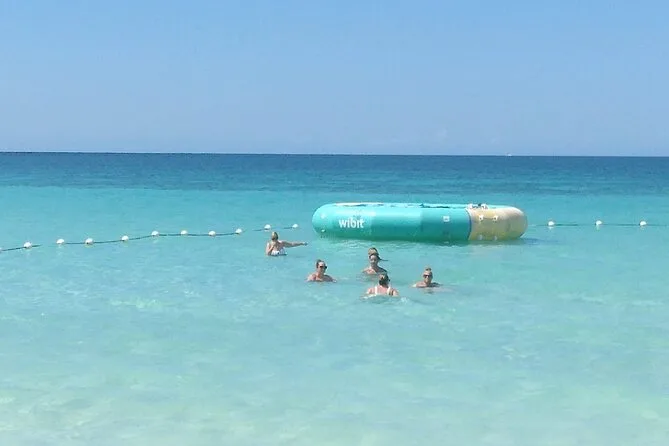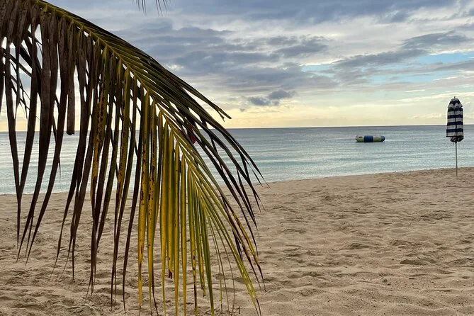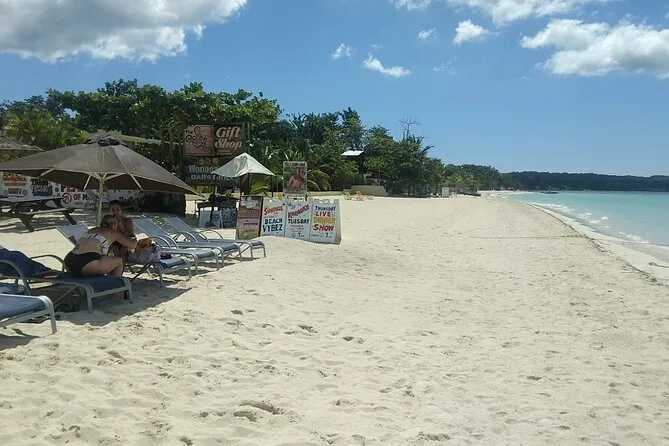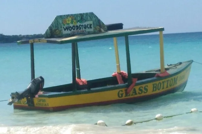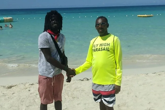 Depois seguimos para a Seven Mile Beach. A areia era mais macia do que eu imaginava — quase como pózinho entre os dedos. Tinha gente vendendo patties e frutas frescas sob guarda-sóis desbotados, música rolando de um bar próximo. Alguns se aventuraram no parasailing (não eu — altura não é meu forte), mas eu experimentei um passeio de barco com fundo de vidro. Vi uma arraia deslizando lá embaixo e parecia que ela estava voando. O almoço foi frango jerk com uma Red Stripe gelada; simples, mas perfeito depois do mergulho na piscina mineral do Blue Hole (que é mais fria do que parece). A água tem um azul inacreditável — não aquele azul de Instagram filtrado, mas o azul de verdade.