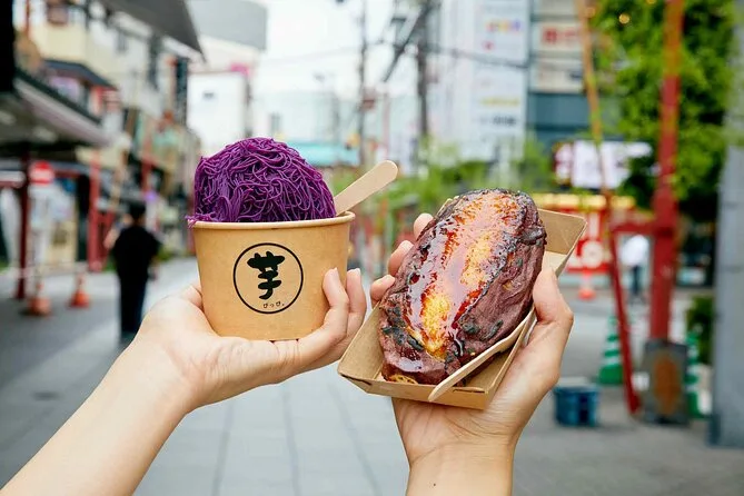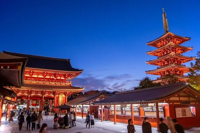 O passeio guiado inclui degustações em lojas locais na rua Nakamise; a entrada no templo Senso-ji é gratuita.