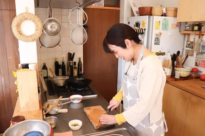 Você vai desfrutar de uma refeição japonesa caseira completa na mesa da anfitriã após cozinharem juntos.