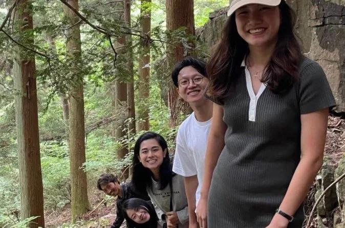 O passeio não passa por aqueles pontos turísticos lotados como o teleférico ou museus—achei que poderia ser decepcionante, mas foi o contrário. Seguimos por estradinhas à beira do lago, onde a água estava tão calma que parecia um espelho, e não havia ninguém por perto. Em um mirante, Takashi mostrou onde o avô dele costumava pescar quando era criança. Paramos para fotos—ele se ofereceu para tirar para nós (“nada de selfie esticando o braço!”, brincou). As folhas de outono começavam a mudar de cor; peguei várias vermelhas perfeitas até encher os bolsos.