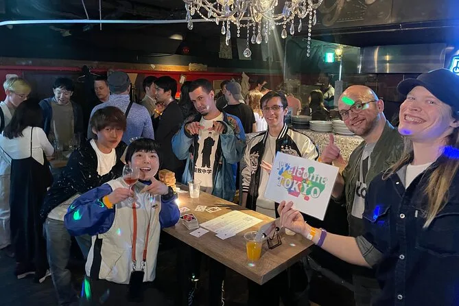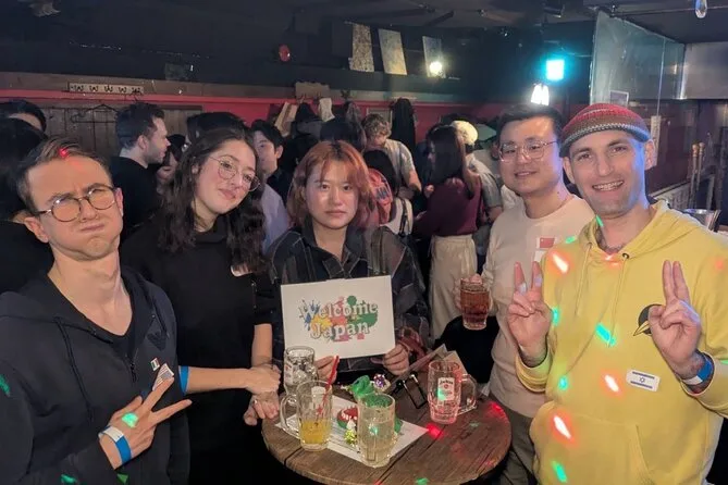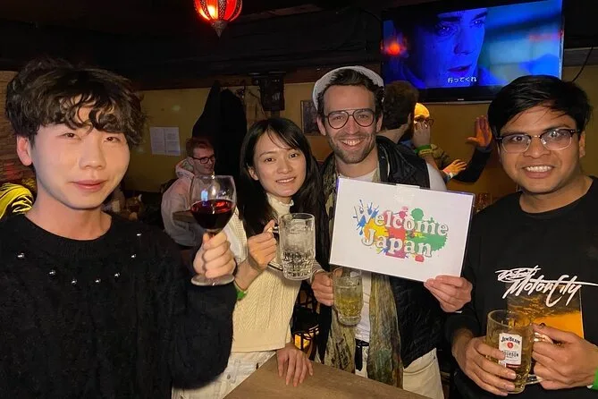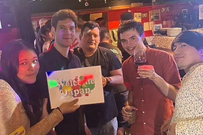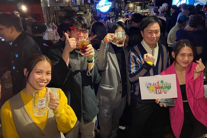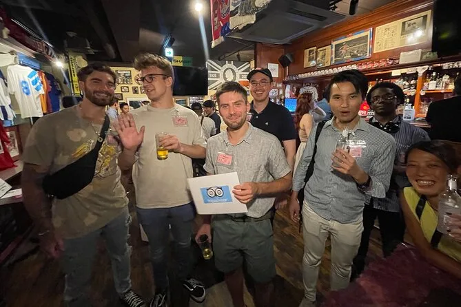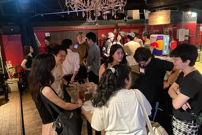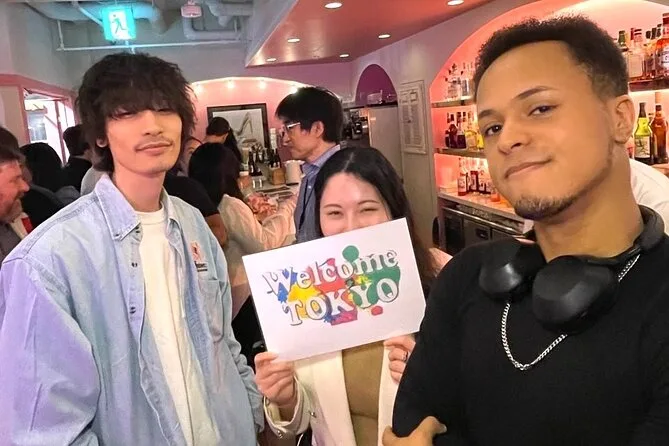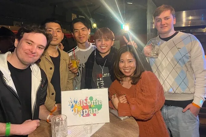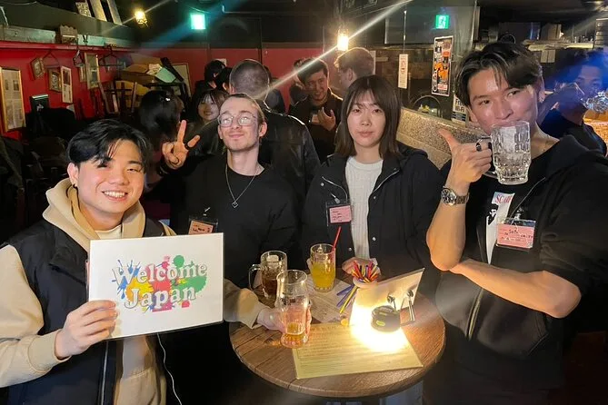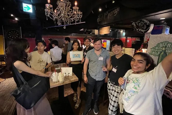 Sua noite inclui entrada num bar animado em Shibuya com open bar das 19h30 às 22h, jogos de mesa como Jenga e Uno organizados pelos anfitriões, além de pulseiras e crachás que facilitam conhecer gente nova — sem precisar falar japonês ou ter conexões prévias.