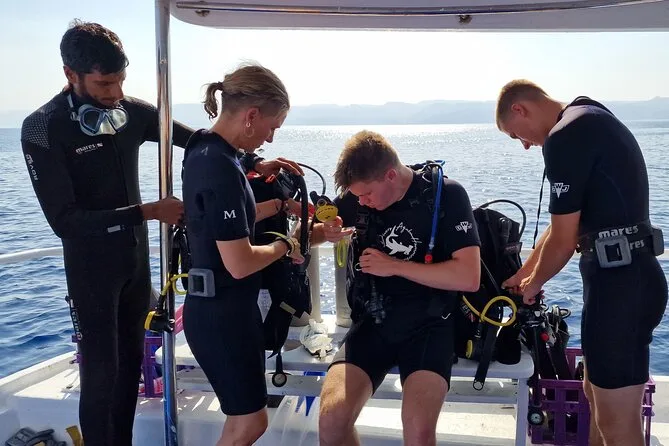 Seu dia inclui transporte privado do hotel em Aqaba até a marina, uso de equipamento de mergulho para um mergulho guiado com especialistas locais, todo o equipamento para snorkel para explorar os recifes na segunda parada, além de um buffet aberto com carnes grelhadas, saladas árabes como a de rúcula, melancia fresca, bebidas quentes e frias — e o transporte de volta ao final da sua aventura no Mar Vermelho.