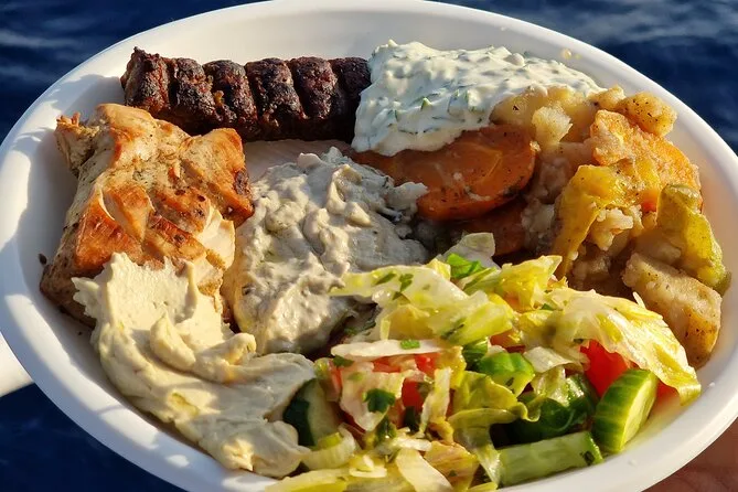 Você terá um buffet com carnes grelhadas (churrasco), saladas árabes incluindo salada de rúcula, além de melancia fresca e bebidas.
