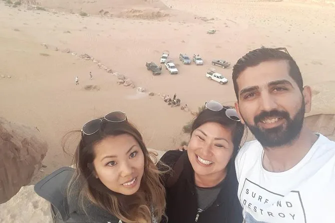Seu roteiro inclui transporte privado com ar-condicionado e WiFi, retirada no hotel ou aeroporto, taxas de estacionamento em toda a Jordânia, um passeio guiado de 4 horas de jipe 4x4 em Wadi Rum (com opção de jantar beduíno, se o horário permitir), além de álcool em gel sempre à mão — o Samir, nosso motorista, nunca esqueceu.