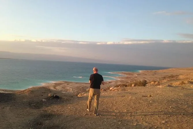 Depois fomos ao Monte Nebo — não é longe, uns 30 minutos de carro. O vento lá em cima é cortante e fresco, trazendo um aroma seco que eu não conseguia identificar direito. Nosso guia explicou como Moisés olhou daqui para a Terra Prometida; em dias claros dá para ver Jerusalém (a gente apertou os olhos, mas só viu uma névoa). Em seguida, fomos para o Mar Morto. Flutuar ali é uma experiência engraçada — você realmente boia como uma rolha, e eu acabei engolindo um pouco de água salgada sem querer (não recomendo). Famílias faziam piquenique na beira, crianças se desafiavam a ir mais fundo. O clima era relaxado, bem diferente do que eu esperava.