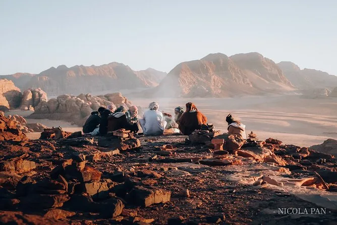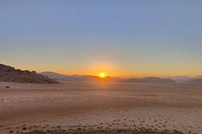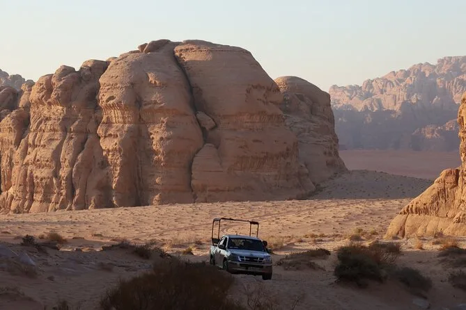 Seu tour 4x4 de dia inteiro cobre todos os principais pontos de Wadi Rum com um guia beduíno simpático. Água mineral está sempre disponível. Almoço no deserto está incluso, assim como jantar e café da manhã no acampamento. Depois do pôr do sol, você terá sua tenda privativa com cobertores à espera — e de manhã, te levamos de volta ao carro ou ponto de ônibus.