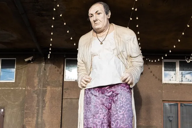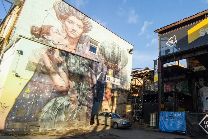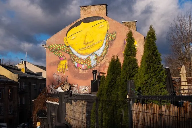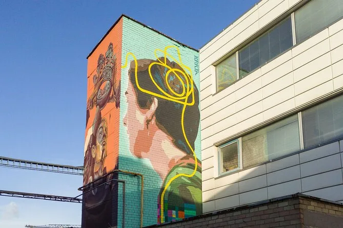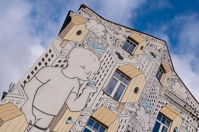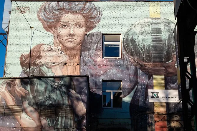 O passeio nos levou até a ELFA—a antiga fábrica que produzia gravadores de fita para toda a Lituânia. Agora? Está coberta de murais vibrantes e abriga uma galeria de arte de rua a céu aberto. Paramos para tirar fotos de uma enorme raposa pintada em três andares. Um leve som de música vinha de um dos lofts acima—talvez uma banda ensaiando para o show da noite.