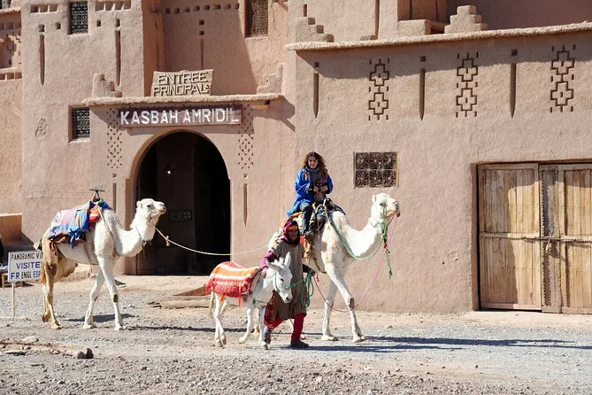 Sim — há um passeio guiado de camelo pelas dunas de Erg Chebbi, perto de Merzouga, com pernoite no acampamento.