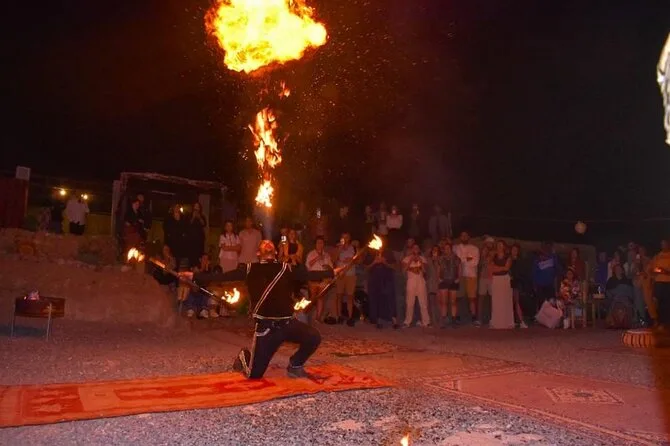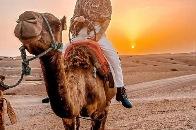 Sua noite inclui traslado do hotel ou ponto de encontro em Marrakech em veículo com ar-condicionado, parada opcional na Barragem de Takerkoust para um chá a caminho do Deserto de Agafay, passeio guiado de camelo ao pôr do sol pelas dunas rochosas, jantar preparado por cozinheiros locais com opções vegetarianas ou veganas, chá e sobremesa, música tradicional ao redor da fogueira — e depois transporte de volta a Marrakech já à noite.