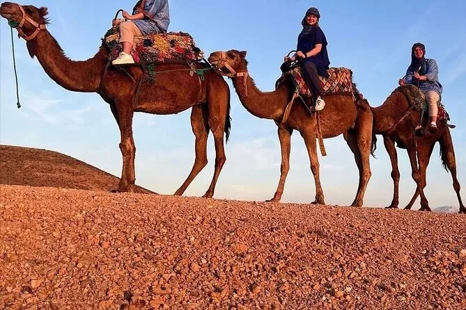 O Deserto de Agafay não era o que eu imaginava — nada de dunas intermináveis, mais um relevo de pedras suaves que vão ganhando tons dourados conforme o sol se põe. Os camelos já estavam lá quando chegamos, com aquele jeito paciente e meio indiferente. Subir foi meio desajeitado pra mim (Youssef sorriu e perguntou “primeira vez?”), mas assim que começamos a andar, uma paz tomou conta. Só se ouvia o barulho dos cascos no cascalho e vozes distantes vindo do acampamento. O pôr do sol chegou rápido — num instante estávamos ainda com o sol nos olhos, no outro tudo se pintou de laranja e rosa. Pensei comigo: aqui o tempo corre devagar, bem diferente da cidade.
