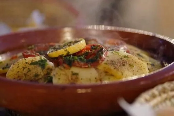 O jantar inclui salada marroquina, tagine de frango/cordeiro/boi (ou opções vegetarianas/veganas), chá, água e sobremesa.