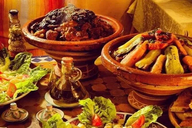 Na hora do almoço, chegamos a Meknes. A cidade tinha um clima diferente: mais imponente, mais viva. O portão Bab Mansour impressionava ainda mais de perto do que nas fotos — enormes portas de madeira com detalhes em metal e mosaicos que brilhavam ao sol. Entramos no El Heri es-Souani, onde ainda se sente o frescor das antigas adegas de pedra. O almoço foi simples e perfeito: tagine e pão fresquinho em um lugar que nosso guia indicou perto da medina. No caminho de volta para Fez, observei o campo passando e percebi o quanto de história conseguimos absorver em um único dia.