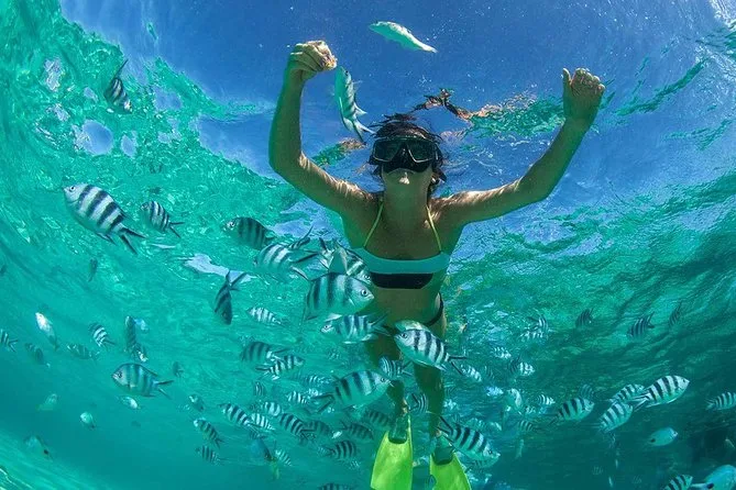 Depois, navegamos até Crystal Rock. A água era tão cristalina que dava para ver o coral no fundo — parecia até coisa de filme, com as cores vibrando. O snorkel foi meu momento favorito; peixes por todos os lados, a luz do sol dançando na água turquesa. Perdi a noção do tempo até alguém me chamar para o almoço (churrasco a bordo: peixe fresco, frango, saladas — muito melhor do que eu esperava). Bebidas à vontade também, o que deixou todo mundo mais animado quando chegamos à Ilha Bénitiers.