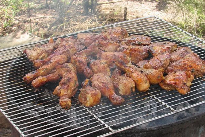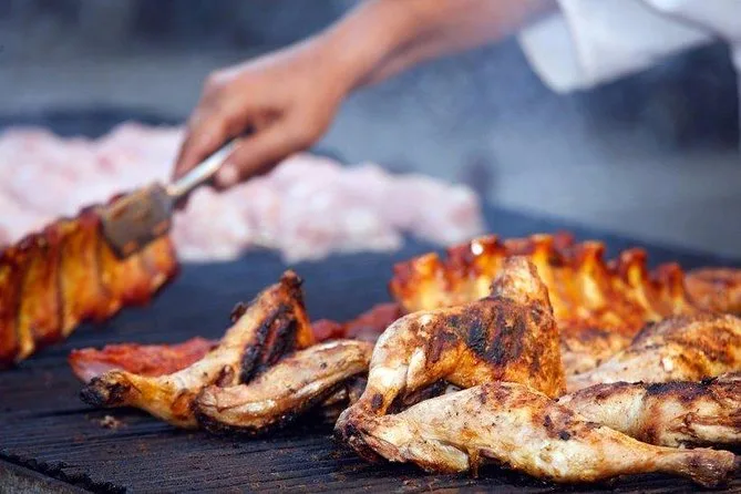 O almoço com churrasco inclui peixe fresco, frango, salada de arroz ou massa, várias saladas frescas e opções de sobremesa.