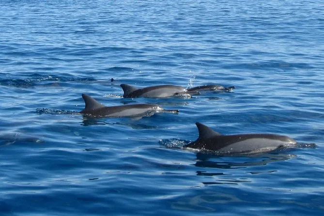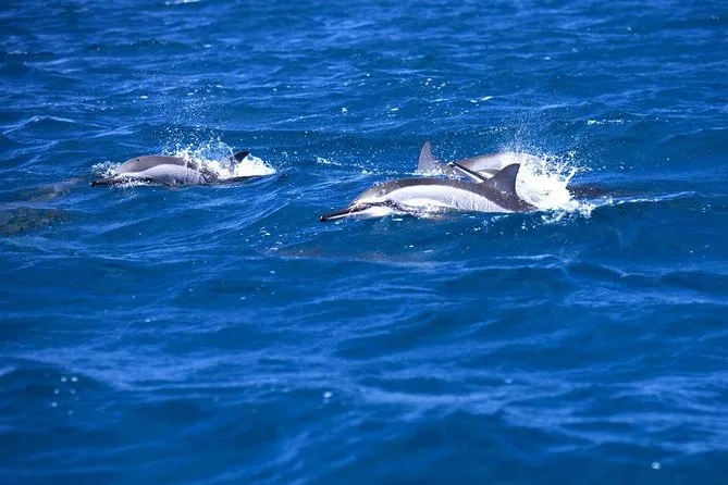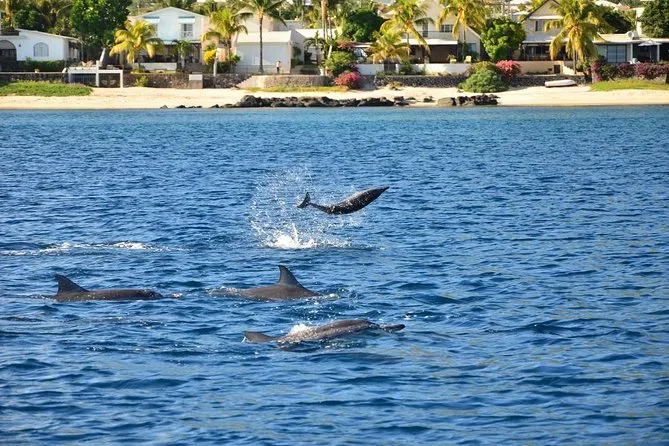 Você terá a chance de ver golfinhos giradores e golfinhos-nariz-de-garrafa na Baía de Tamarin durante o passeio.