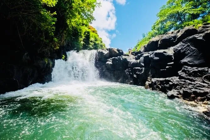 É um passeio de dia inteiro que inclui navegação, visita à cachoeira, almoço na Ile Aux Cerfs, snorkel e retorno.