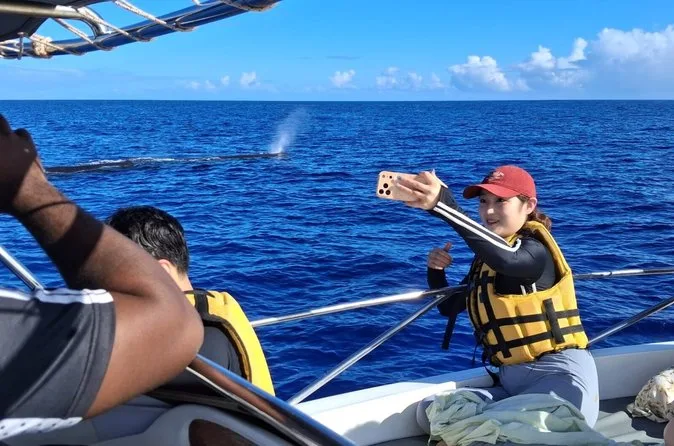 Depois, nos aquecemos com um chá doce e deixamos as pernas balançando na beira enquanto alguém apontava os peixes-voadores que pulavam perto. A transição do nado com golfinhos para a observação das baleias foi mais lenta — um silêncio tomou conta quando nosso guia baixou um microfone estranho (hidrofone?) na água. Ficamos atentos aos cliques e aos sons profundos. É curioso como todo mundo fica quieto esperando algo enorme ali embaixo. As cachalotes estão por aqui o ano todo, mas estávamos na esperança das jubartes — o melhor período é de junho a outubro. Não vimos nenhuma saltar (quem sabe da próxima), mas só ouvir aqueles sons ecoando já foi... não sei, algo que te conecta?