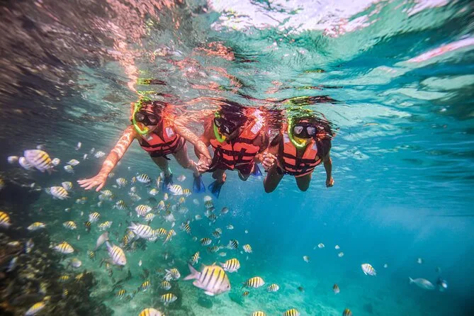 Seu dia inclui transporte de catamarã ida e volta entre Cancún e Isla Mujeres com guias locais amigáveis que conduzem o snorkel no Recife El Meco (equipamento incluso), além de acesso a um beach club privado com espreguiçadeiras, palapas, piscina e Wi-Fi. Dependendo da sua escolha, você aproveita bar aberto com buffet ou almoço em caixa com bebidas, finalizando a aventura no alto da Torre Escénica de Cancún para vistas incríveis do Caribe.