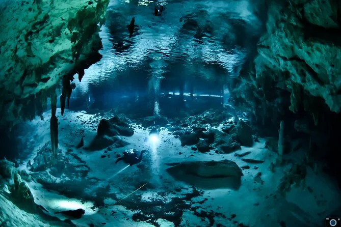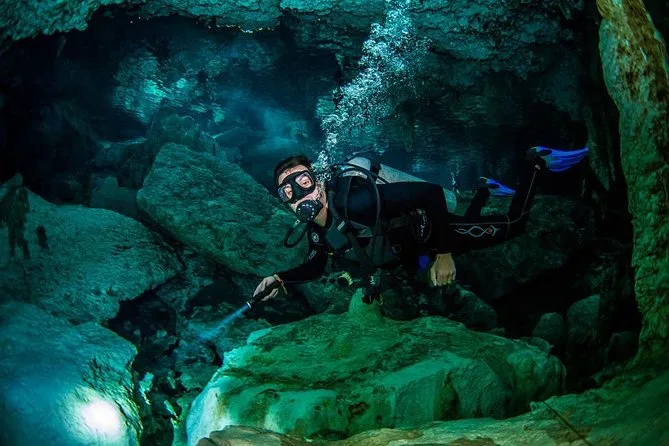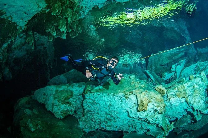 Seu dia inclui transporte ida e volta do centro de mergulho em Tulum até o cenote Dos Ojos, entrada paga, todo o equipamento de mergulho (incluindo roupas e lanternas), um instrutor local experiente guiando as duas imersões pelas rotas Barbie Line e Bat Cave, além de lanches e água potável entre os mergulhos antes do retorno.