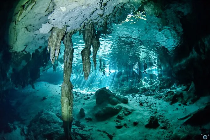 O passeio inclui duas imersões em cavernas no cenote Dos Ojos.