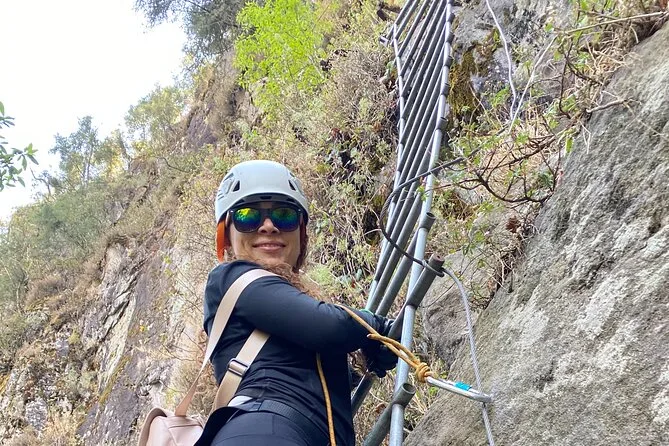 A trilha começa suave, mas não se engane. Logo estávamos subindo em um bom ângulo — minhas panturrilhas sentiram cada passo. O caminho serpenteia ao lado de riachos que fazem um barulho mais alto do que você imagina, especialmente depois da chuva. Em um trecho, entramos em um túnel esculpido na rocha; o cheiro de terra molhada e musgo dominava o ambiente. Tem uma escada com cerca de 30 metros de altura — parece intimidadora, mas com o equipamento fornecido, até quem não é expert se sente seguro.