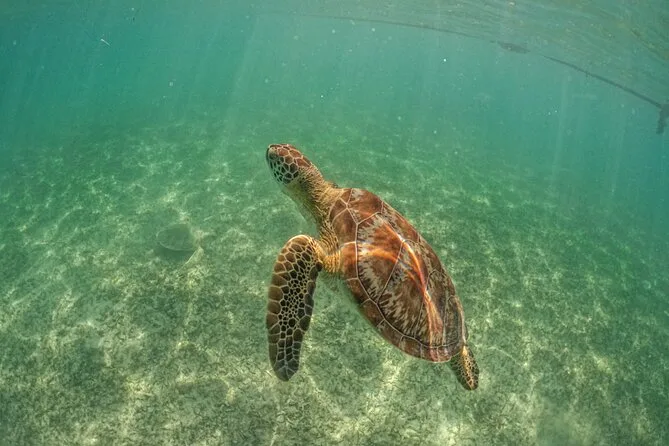 Última parada: a baía de Akumal para ver as tartarugas marinhas. Você entra devagar com a máscara, torcendo para ver algo além das suas próprias nadadeiras — e de repente, uma tartaruga tranquila aparece ali, comendo capim marinho bem debaixo de você. O silêncio debaixo d’água só é quebrado pelo som da sua respiração borbulhando. Os guias ficam de olho em todo mundo e brincam se alguém fica nervoso (o que é normal — um cara do nosso grupo esqueceu totalmente como usar o snorkel). Ficamos ali flutuando por uns 30 minutos? O tempo parecia desacelerar. Na praia, depois, alguém me ofereceu fatias doces de abacaxi enquanto esperávamos o almoço — arroz, frango, tortillas — e juro que comida tem outro sabor depois de um mergulho assim.