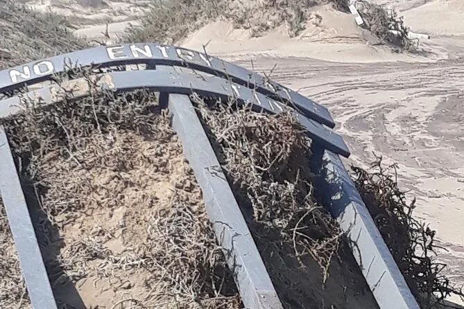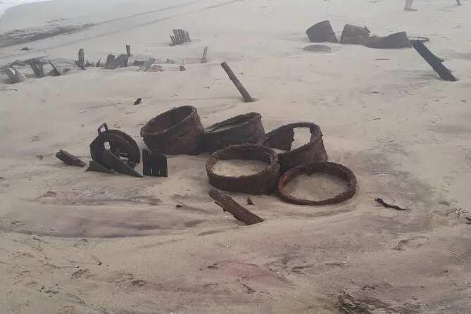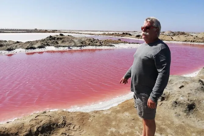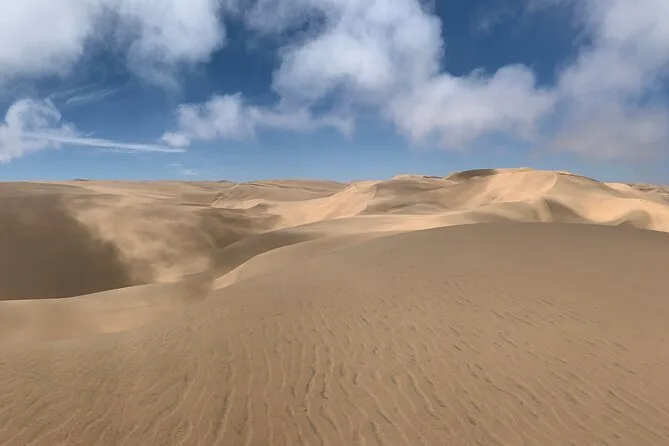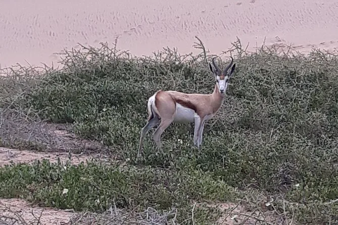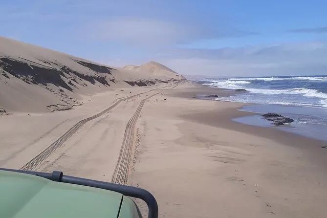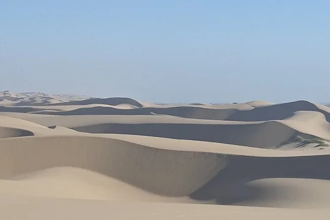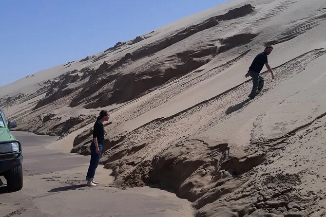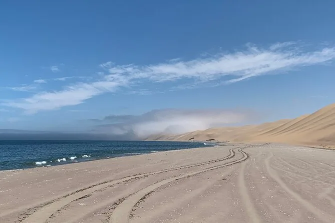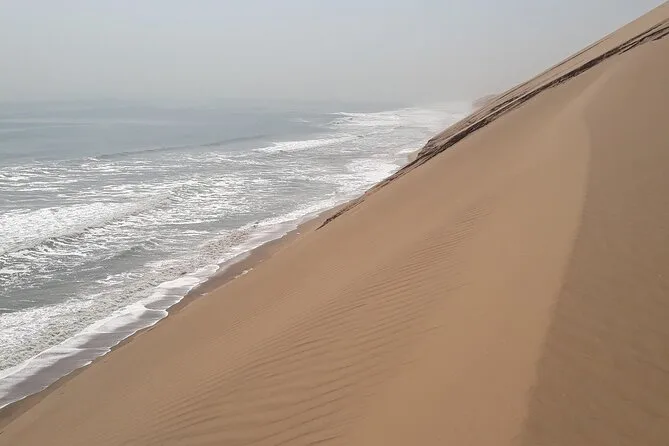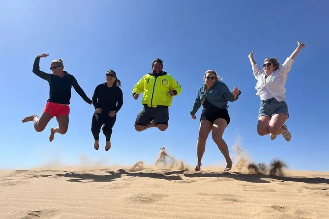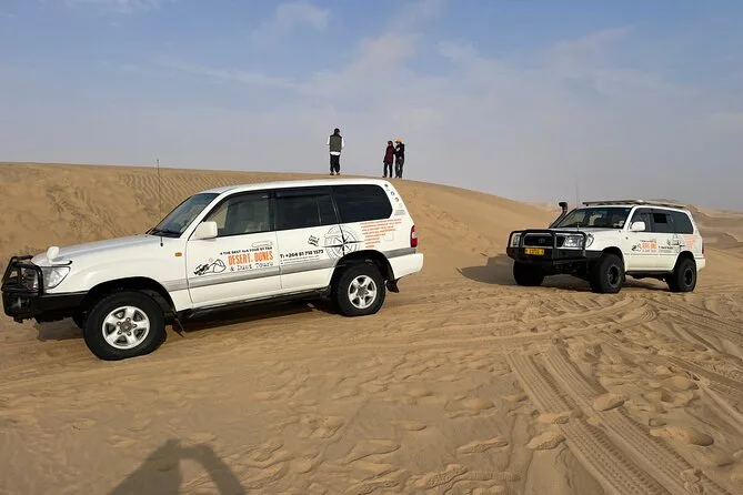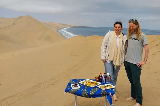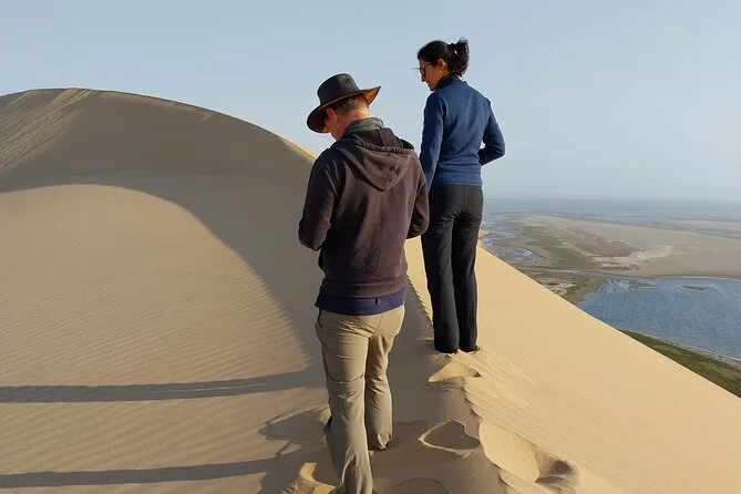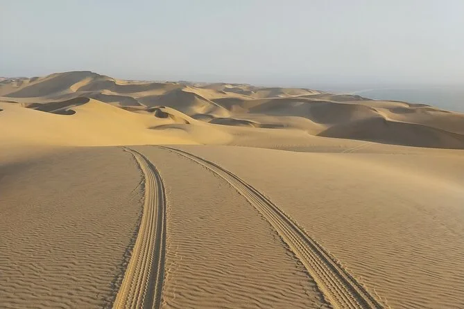 Seu dia inclui um passeio guiado saindo de Walvis Bay, passando pelos pântanos cheios de flamingos e pela maior mina de sal da África antes de seguir para o sul pela costa até Sandwich Harbour; você terá bebidas geladas (cerveja, cidra, água) e petiscos enquanto o guia local navega pelas dunas impressionantes e conta histórias sobre a vida nas areias em constante mudança da Namíbia.