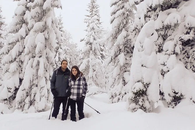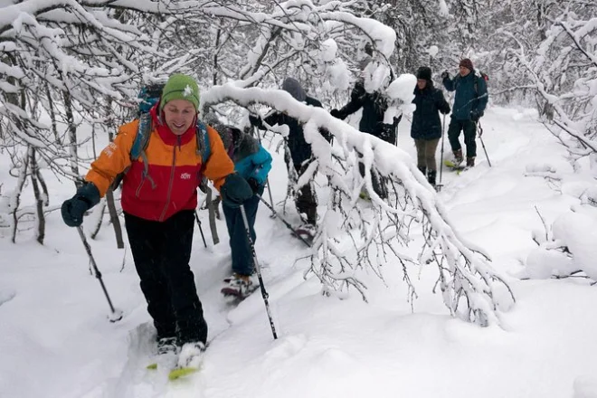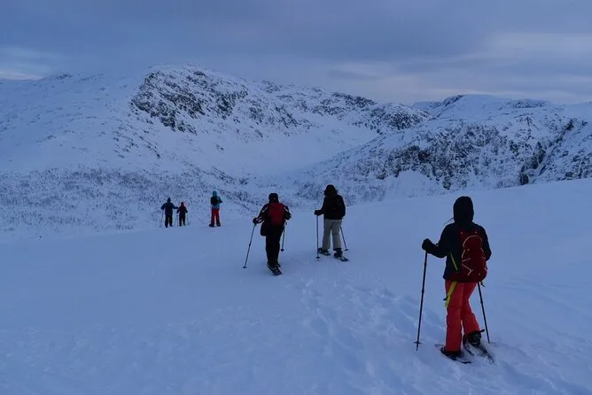 Seu dia inclui transporte do centro de Tromsø, ida até o topo da ilha Tromsøya, todo o equipamento como raquetes e bastões, guia local que compartilha histórias pelo caminho, além de uma pausa para aquecer com bebidas quentes e lefse antes de voltar juntos para a cidade.