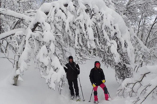 Você vai caminhar na neve fresca da ilha Tromsøya com um guia local simpático, aprendendo a usar as raquetes no caminho. Espere histórias sobre a vida em Tromsø, paradas para fotos entre as bétulas e uma pausa para bebidas quentes e lefse — aquele doce norueguês que você vai querer provar de novo. É uma caminhada de inverno tranquila que vai ficar na memória muito depois de suas botas secarem.