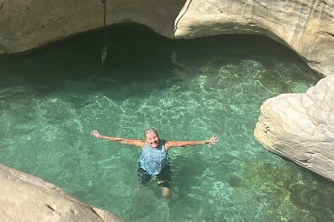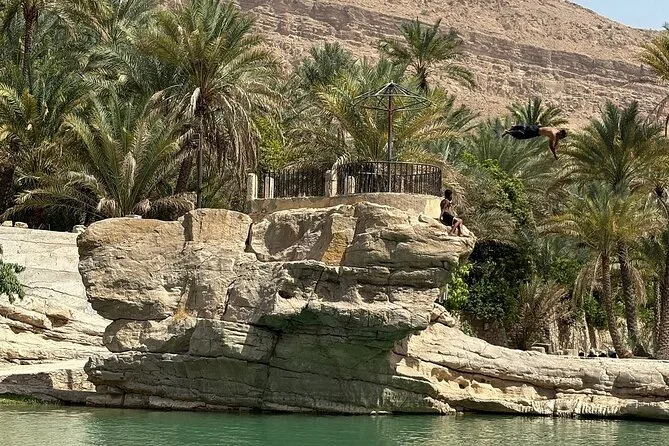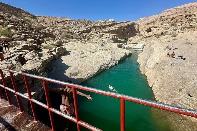 Depois seguimos numa longa estrada até Wadi Bani Khalid. A estrada serpenteava por colinas rochosas e, de repente, se abriu para um cânion com água tão cristalina que dava para ver cada pedrinha no fundo. Crianças brincavam na água enquanto alguns homens mais velhos conversavam calmamente sob uma palmeira, falando em árabe. Salim explicou que as mulheres precisam usar camiseta e shorts na altura do joelho para nadar (nada de biquíni), o que fez sentido quando vi tantas famílias por ali. A água estava gelada no começo, mas em dois minutos eu não queria mais sair. Tem algo mágico em nadar num wadi — a luz do sol refletindo nas falésias, libélulas passando perto do ouvido — que faz você esquecer do resto do mundo por um tempo.