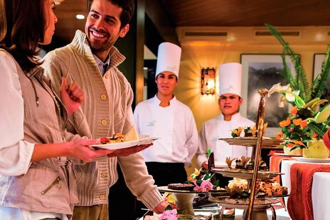 Você vai saborear scones, sanduíches, petiscos, chá ou café e uma seleção de vinhos durante o chá da tarde no Belmond Sanctuary Lodge.
