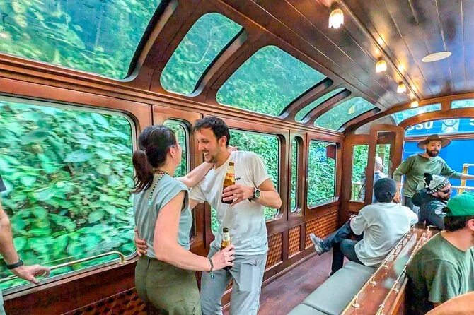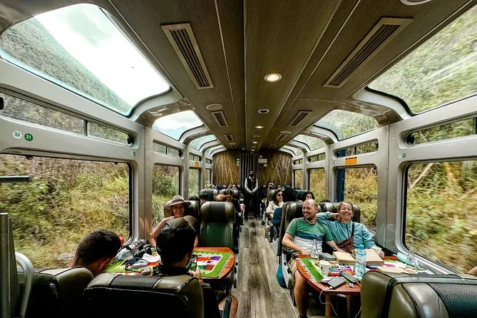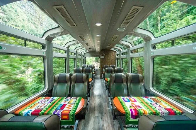 O retorno é feito de trem panorâmico Vistadome ou 360°, seguido de transfer de ônibus até seu hotel em Cusco.