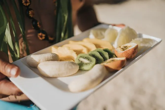Depois do almoço, pegamos uma canoa va’a para duas pessoas (o Ken chamou assim, acho que pronunciei errado) e remamos até um jardim de corais perto da praia. A água era tão transparente que dava para ver cada peixinho passando entre as pernas. Fazer snorkel ali foi como estar dentro de um aquário — pargos azuis brilhantes por todo lado e uns peixinhos amarelos pequeninos que ficavam seguindo meus dedos. Sinceramente, o tempo perdeu a noção lá fora; só lembrei do celular quando voltamos para um último drinque antes do barco nos levar de volta.