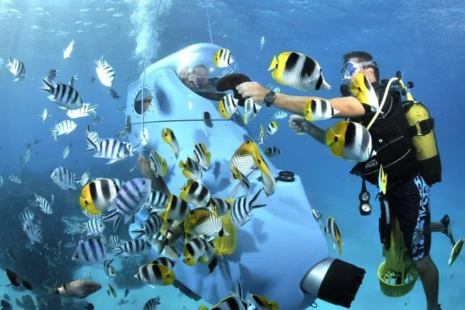 Você vai mergulhar na famosa lagoa de Bora Bora em uma scooter subaquática — respirando tranquilo enquanto peixes coloridos passam pela sua cúpula. Com transfer do hotel incluso e um guia local simpático te acompanhando, até quem não sabe nadar pode curtir. Depois, frutas frescas e suco ficam ainda mais gostosos enquanto você seca ao sol da ilha.