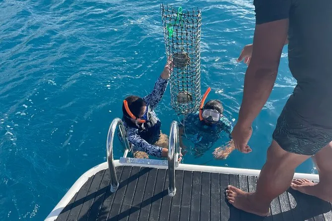 Sim, cada pessoa escolhe uma ostra durante o snorkel e fica com a pérola negra encontrada dentro como lembrança.