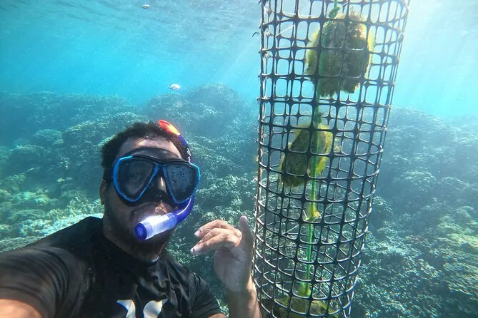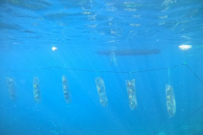 O snorkel nos jardins de coral foi mais silencioso do que eu esperava—o único som era minha respiração e conversas distantes no barco. As cordas de ostras penduradas pareciam colares estranhos debaixo d’água. Escolhi uma que parecia mais resistente (nem sei por quê), e Tama me ajudou a trazê-la para a superfície. Alguém gritou que viu uma arraia manta, mas eu perdi—ainda fico me culpando por isso.