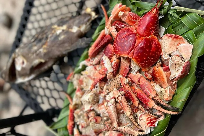 O almoço inclui uma degustação de caranguejo coco e vinho de Rangiroa.